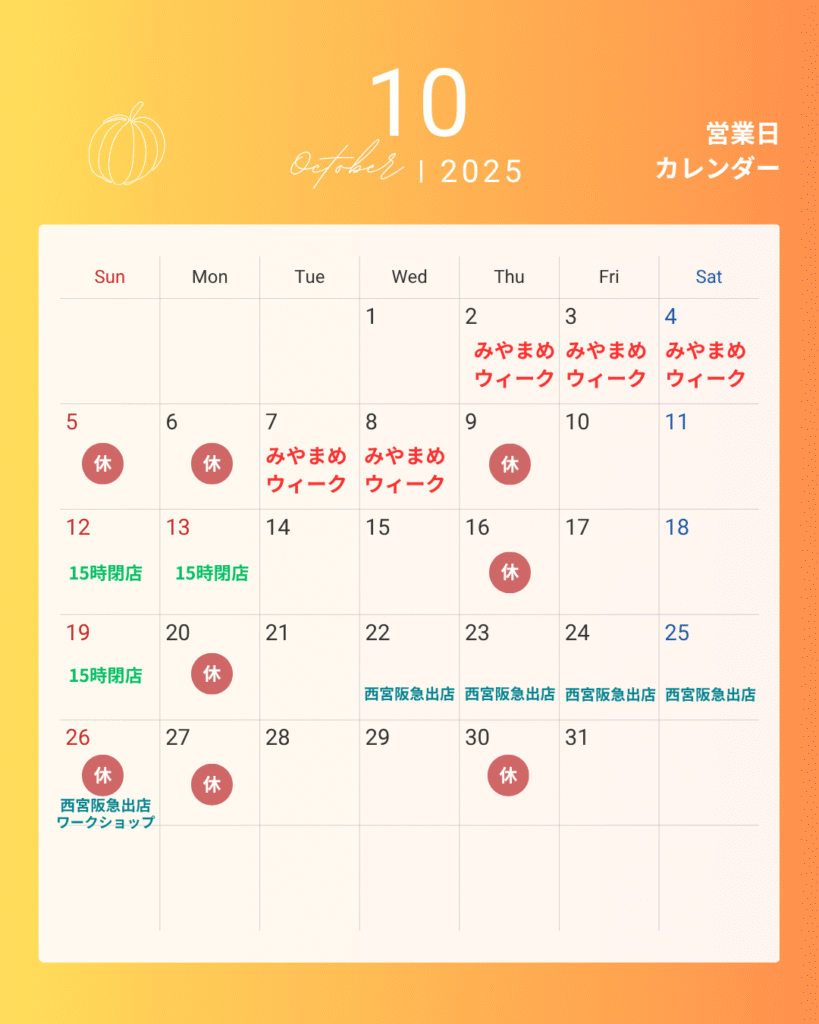 遅くなりましたが、10月の営業スケジュールをお知らせいたします。