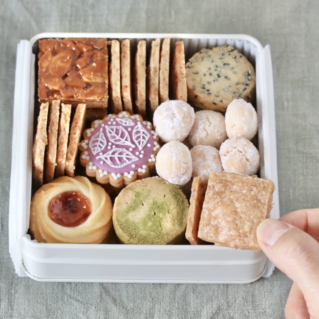 絞り出しジャムクッキー(苺)、抹茶のマーブルクッキー、黒ゴマクッキー、甘さ控えめクッキー、アイシングクッキー、米粉のブールドネージュ、フロランタン、ココナッツクッキー