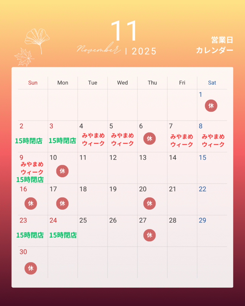 ②3連休は11/1㈯を除いて営業しますが、㈰㈪は15時閉店ですので、お気を付けください。