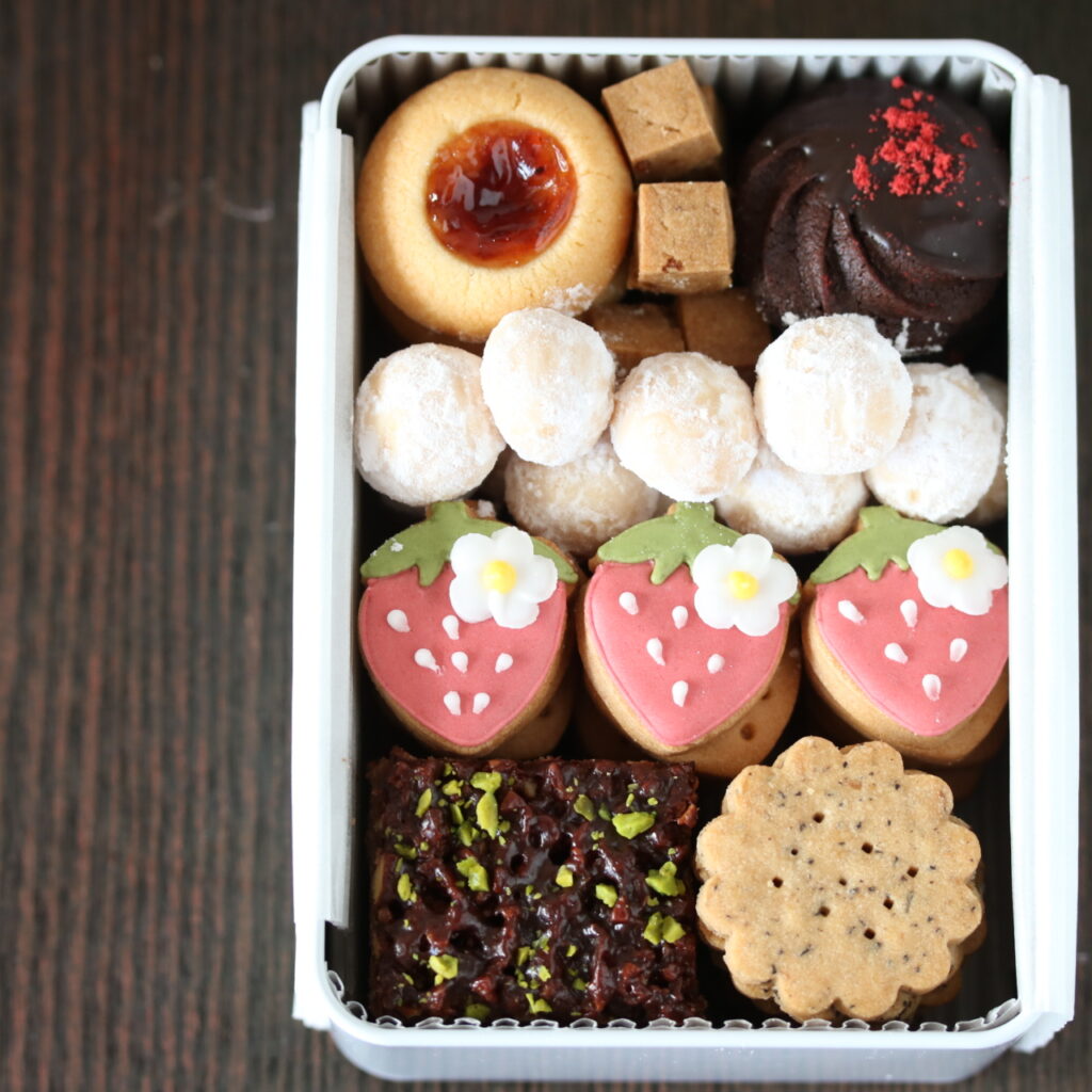 アイシングクッキー(苺)、苺のスタンプクッキー、米粉のブールドネージュ、カフェオレサンド、ヴィエノワWショコラ、黒糖キューブ、色々ナッツのショコラフロランタン、苺ジャムクッキー