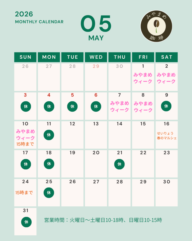 みやまめ珈琲のGW営業スケジュールは以下の通りです。